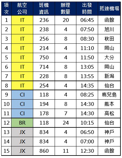 搭乘以下指定航班旅客可參與臺日機場入境事先確認作業