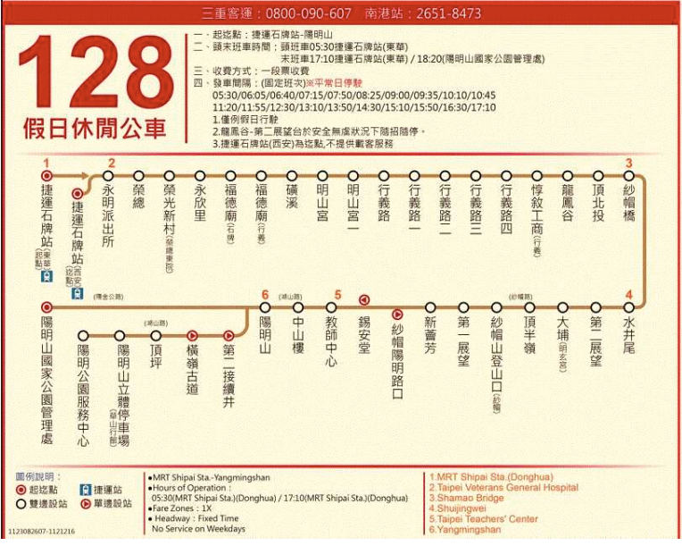 - 北投 → 新北投 → 泉源路 → 龍鳳谷遊客服務站 → 鼎筆橋 → 紗帽路 → 陽金公路 → 陽明山國家公園管理處遊客中心