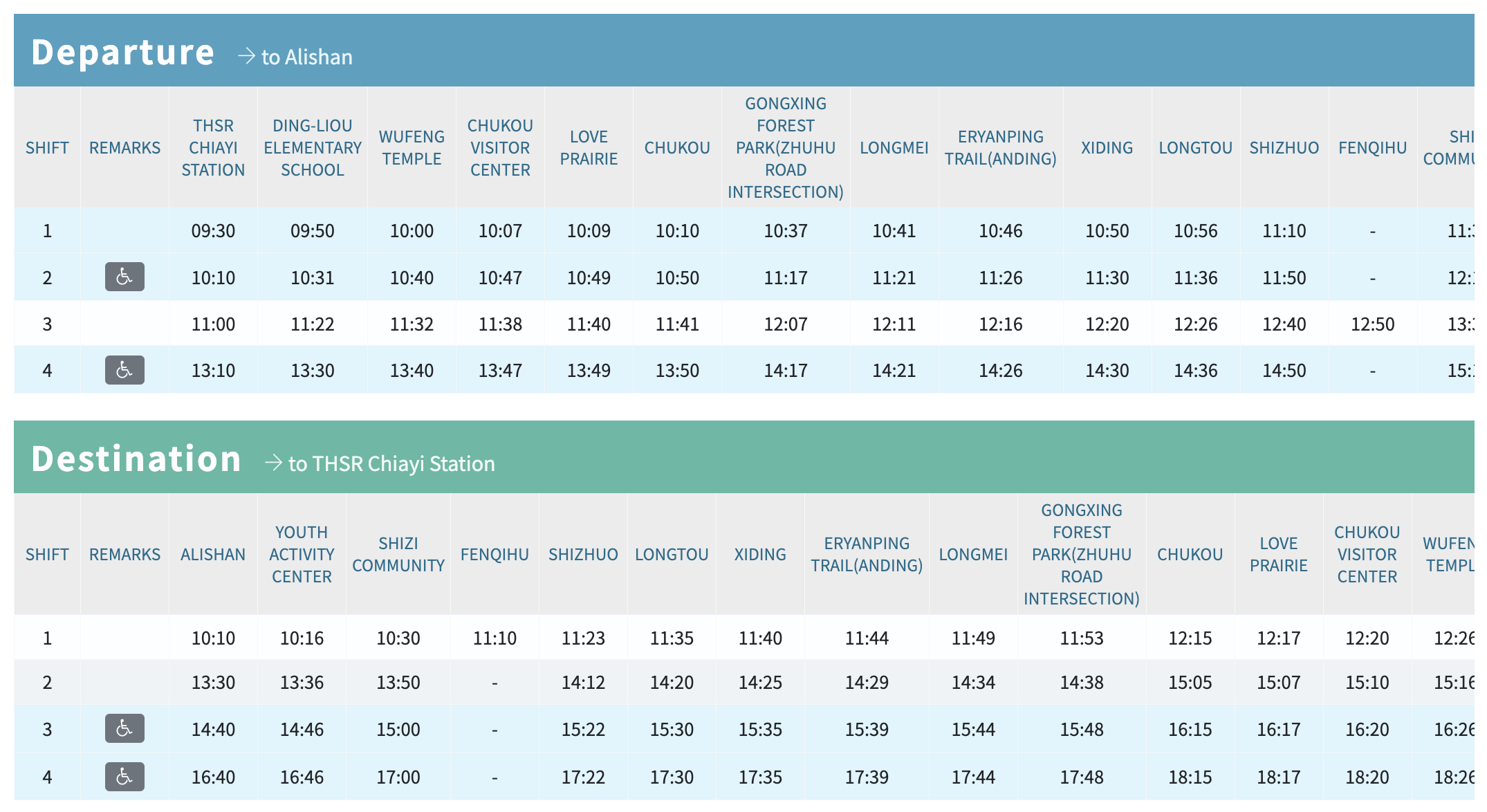 - High-Speed Rail Chiayi Station Exit 2 Platform 7 → Taiwan Tourist Shuttle Alishan A Line
