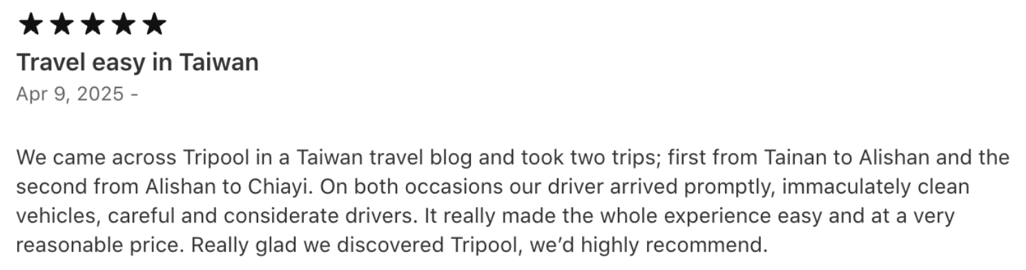 If you’re still planning transportation for Chiayi attractions or need a private Alishan charter itinerary that includes nearby stops, feel free to calculate the cost with tripool first and decide afterward. You can still modify or cancel free of charge up until 6:00 a.m. the day before departure, so you can finalize your trip with complete peace of mind.