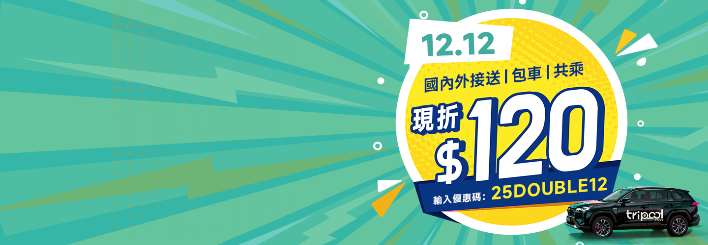 📅 12月8日–12月15日期間內輸入折扣碼【25DOUBLE12】,每筆訂單可現折$120元! 預定海外機場接送/包車消費滿$2,000至網頁底部FAQ處登記再贈網卡。 乘車日期於2026年6月30日前均適用。